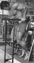 - 손의 위치: 딥스 바나나봉을 양손으로 어깨너비로 잡았습니다. 발이 몸을 향해야 하고, 팔이 완벽하게 반응한 상태에서 시작됩니다.